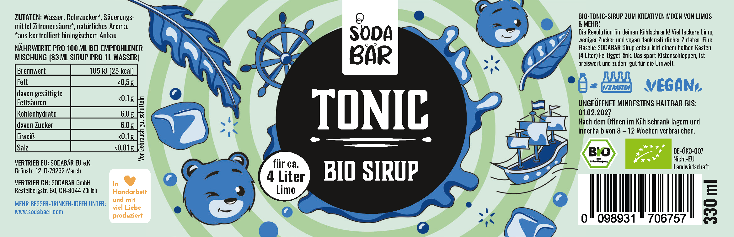 - Tonic: Wasser, Rohrzucker*, Säuerungsmittel Zitronensäure*, natürliches Aroma